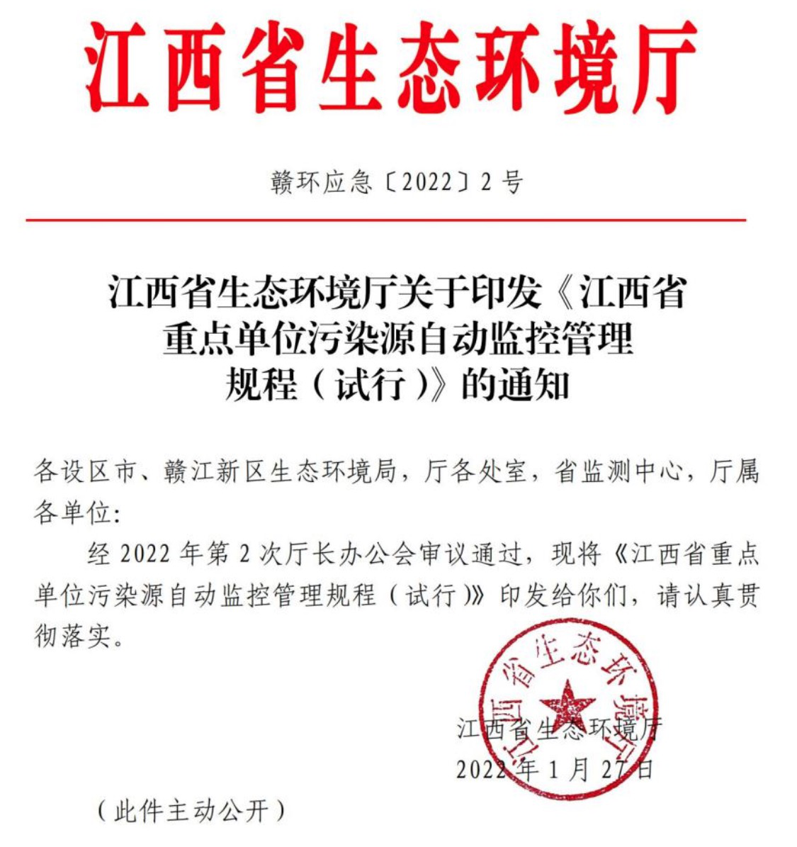 近日,生态环境部办公厅以环办转发函〔2023〕1号文下发了《关于转发<江西省重点单位污染源自动监控管理规程(试行)>的通知》,这是近年来江西省深入贯彻落实生态环境部《关于优化生态环境保护执法方式提高执法效能的指导意见》,进一步优化营商环境,探索非现场监管执法体系建设方面进行有益探索的成果表现,也为江西省进一步精准打击环境违法行为,持续建立健全以污染源自动监控为主的非现场监管执法体系夯实了制度保障。